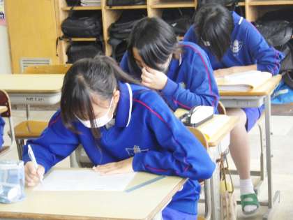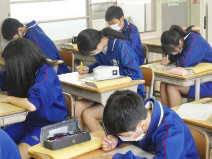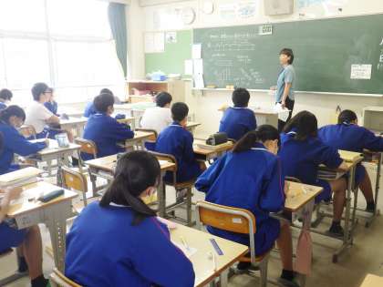 32学級は、理科の授業の様子です。来週行われる前期中間テストに向けて、まとめプリントを行った後、解き方・考え方の解説を聞きながら、理解を深めていました。