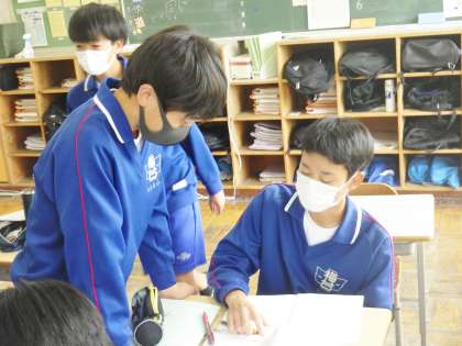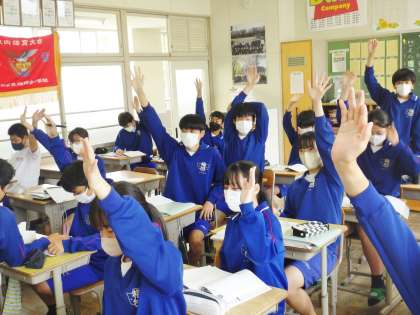 34学級は、数学の「平方根」の授業の様子です。練習問題を解き、疑問点があると、級友と積極的に意見を交換していました。発言も積極的に行うなど、学習意欲の高さを感じました。