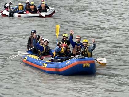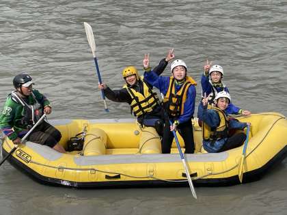 ラフティング活動の様子です。写真は、最後の岸に着く直前の場面です。終わった生徒に感想を聞くと「すごく楽しかった!また、やりたい!」と満面の笑顔で話してくれました。