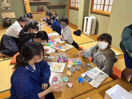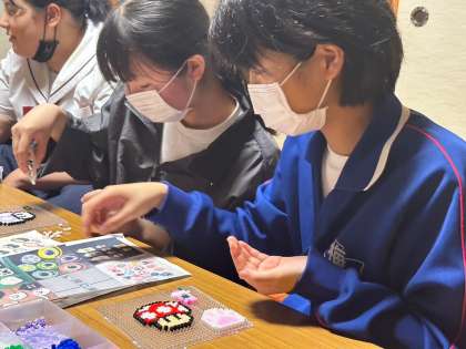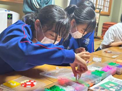 ペンションでの「ふれあいタイム」の様子です。ビーズでコースターを作っています。