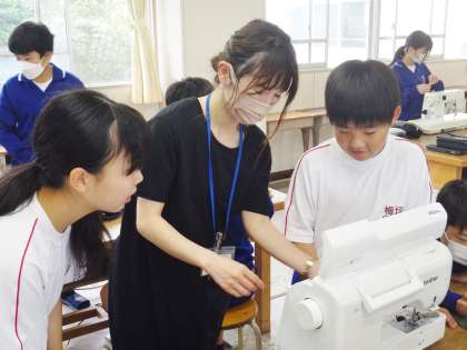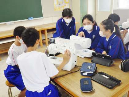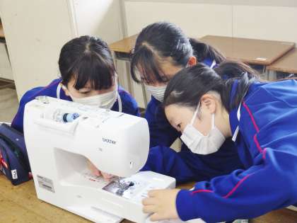 11学級は、家庭科の「生活を豊かにするものの製作」の授業の様子です。ミシンの使い方を学習していました。「ボビンに糸を巻く」「上糸と下糸のセットをする」作業を悪戦苦闘しながら行っていました。「小学校のときやったけど、中学校では初めてなので今思い出しながらやっています」と話し、教師や級友と確認していました。