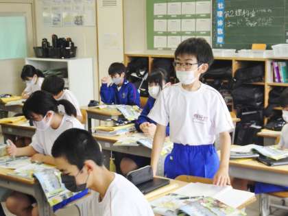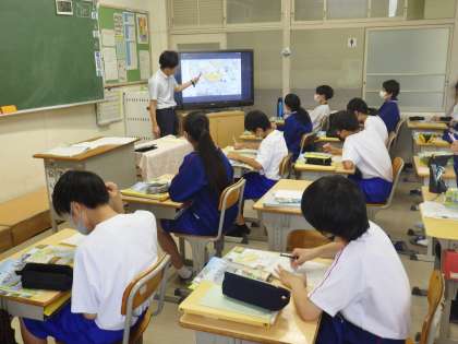 12学級は、社会の「アジア州」の授業の様子です。アジア州の地形をデジタル教科書の映像を見ながら、確認していました。自分で教科書等で調べてわかった地形名は、積極的に発言していました。