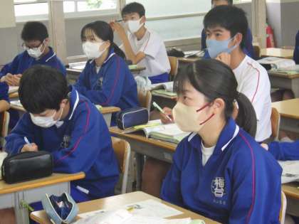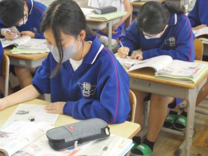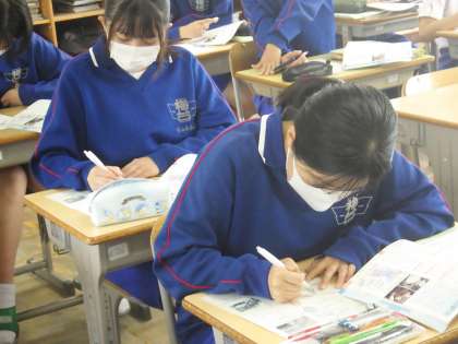 33学級は、社会の「冷戦の開始と植民地の解放」の授業の様子です。教師の話を集中して聞き、学習プリントに大切なポイントをまとめながら理解を深めていました。