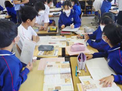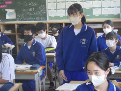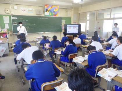 生徒は、班での話し合いでは自分の考えを積極的に伝えたり、全体の話し合いでは堂々と発表したりと、意欲的に学習に取り組んでいました。教育実習生も落ち着いて、生徒の考えを引き出していました。とてもすばらしかったです。
