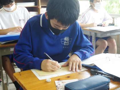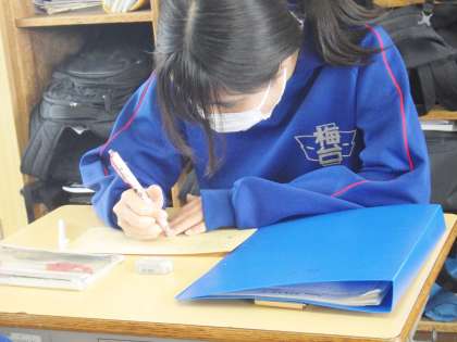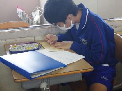 職場体験学習を受け入れていただいた事業所にお礼状を送ります。本日は、お礼状を入れる封筒に事業所の住所を一文字一文字気持ちを込めて丁寧に書いていました。