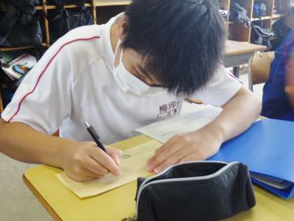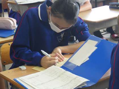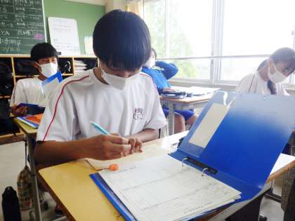 事業所の住所を書いている22学級の様子です。