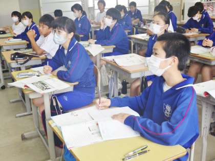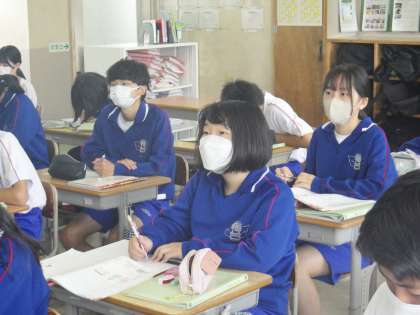 22学級は、英語の「to不定詞を使った文法」の授業の様子です。教師の話を集中して聞いたり、デジタル教科書で確認したりしながら、理解を深めていました。
