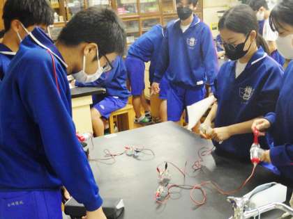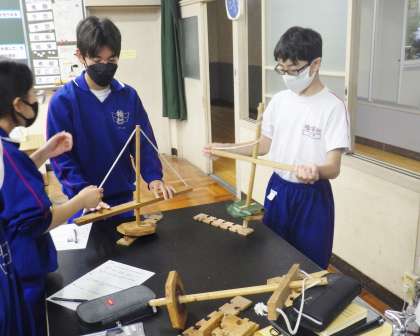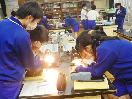 33学級は、理科の「仕事とエネルギー」の授業の様子です。エネルギーの移り変わりについて、「発光ダイオードに光をあてて電子オルゴールを鳴らす」などの様々な実験を行いながら、理解を深めていました。「何か難しそうだったけど、実際に実験を行ってみるとよくわかった」という声が聞こえてきました。