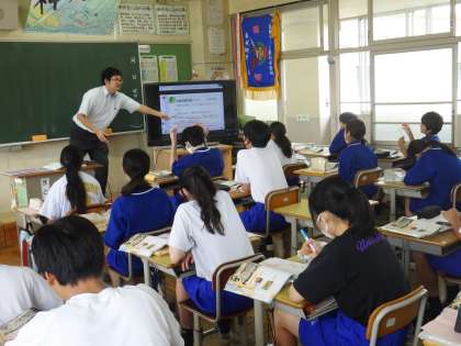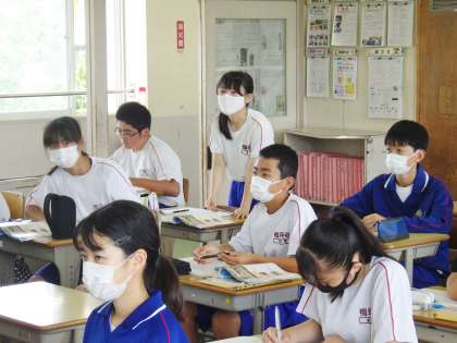 23学級は、社会の「江戸幕府の成立と対外政策」の授業の様子です。武家諸法度の「新しい城を造ることは厳しく禁止する」理由について話し合いながら、江戸幕府と大名の関係について理解を深めていました。