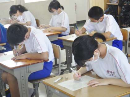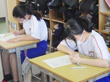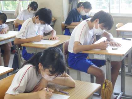 2年生の朝の学習の様子です。教室では、エアコンがフル稼働です。生徒は来週行われる英語のドリルコンテストのプレ問題を集中して解いていました。
