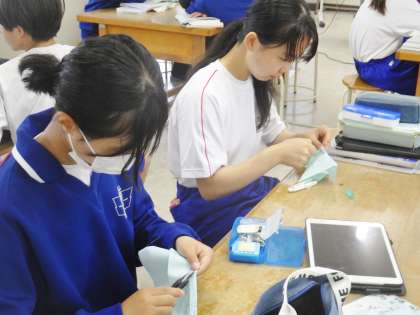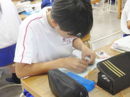 11学級は、家庭科の「衣食住の生活」の授業の様子です。学習課題は「基礎縫いを確認しよう」です。「玉結び・玉止め・並縫い」に一生懸命取り組んでいました。「小学校のときにやったので簡単」「うまく縫えない。難しい」などの声が聞こえてきました。