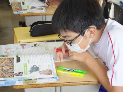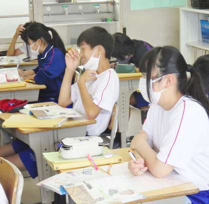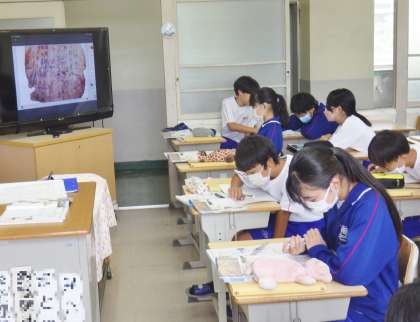 12学級は、社会の「中国文明の発展」の授業の様子です。デジタル教科書で甲骨文字の映像を見ながら、日本の漢字を探していました。「甲骨文字は解読されているんですか?」など、疑問に感じたことは積極的に質問するなど、活力ある授業が展開されていました。