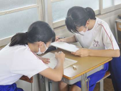 7/12(水) 授業の様子です(3年生) 1 公開日 2023/07/12 更新日 2023/07/12 お知らせ 3年生の授業の様子です。 31学級は、数学の授業の様子です。明日行われる第1回学習診断テストに向けて対策プリントを解きながら、考え方を級友と確認していました。