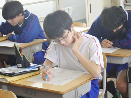 34学級は、理科の授業の様子です。明日行われる第1回学習診断テストに向けての対策プリントを解いた後、解き方・考え方の説明を集中して聞き理解を深めていました。