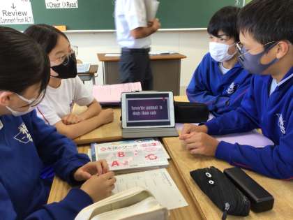 身近な話題について、英語で意見文を作成し、学習用タブレットのプレゼンテーション機能を使って意見発表を行いました。ALTの先生方に、英語でプレゼンをし、質疑にも英語で一生懸命に応えていました。学習用タブレットのパワーポイントの機能を巧みに操作し、外国の人にも伝わる見事な意見発表を行っていました。