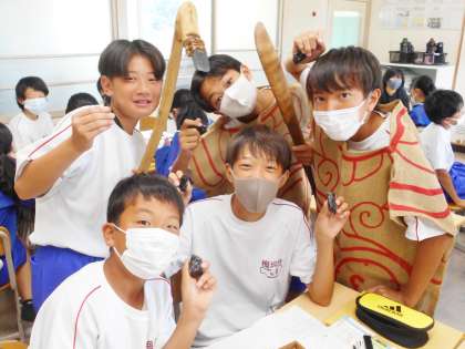 /18(火) 旧石器時代、縄文時代、弥生時代の実物体験を行いました(1年生) 2