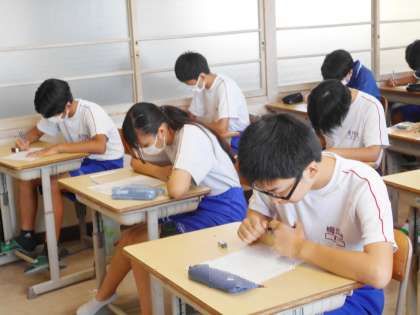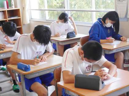 32学級は、英語の「Unit3」の単元テストの様子です。夏休み前に学習した内容の問題を集中して解いていました。