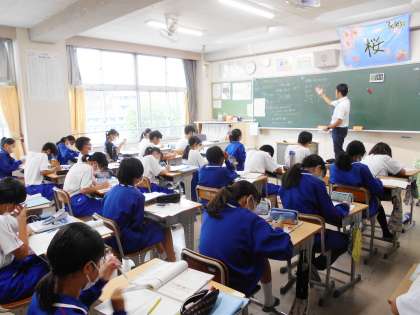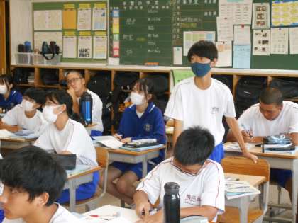 13学級は、数学の「方程式」の授業の様子です。式の立て方を考え、解を求めていました。解き方がわかったときは、積極的に挙手し、堂々と説明していました。