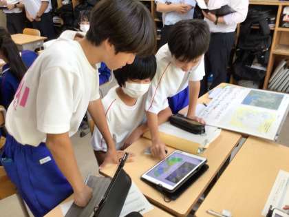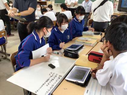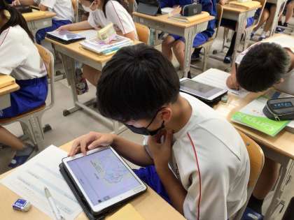 1年生の社会で研究授業を行いました。豊田市周辺は、歴史的にみて稲作を始めた時期が他地域より遅かったことを知った生徒たち。その理由を解明するために、豊田市の地形や河川の地図を参考にしながら、仲間と熱心に話し合いました。