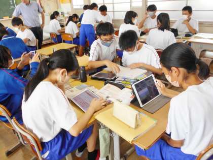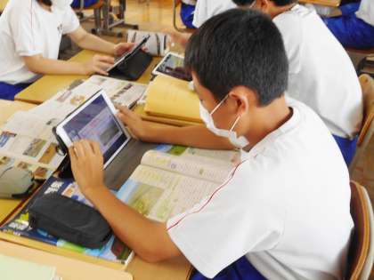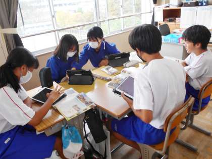 23学級は、社会の「日本の諸地域」の授業の様子です。グループごとに地域を決め、その地域の特色を学習用タブレットを活用しながら調べていました。また、調べた内容を学習用タブレットの様々な機能を使ってわかりやすくまとめていました。