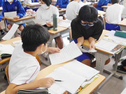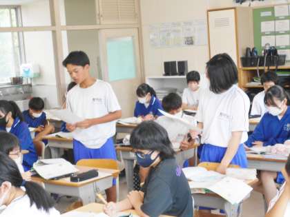 9/21(木) 授業の様子です(1年生) 2 公開日 2023/09/21 更新日 2023/09/21 お知らせ 12学級は、英語の「Unit5」の授業の様子です。ペアになって会話文を読み合いながら、内容の理解を深めていました。会話している様子を見ていて、発音がとてもしっかりできていてすごいと思いました。