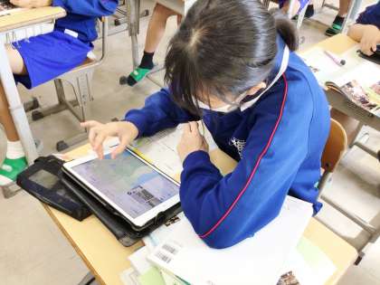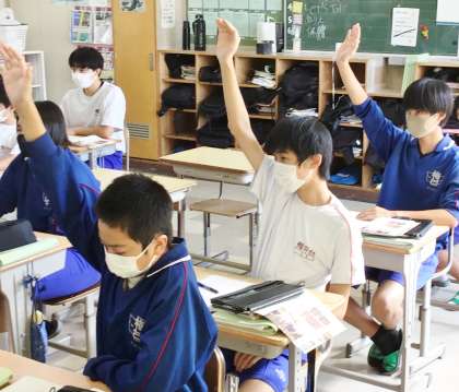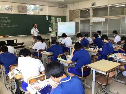32学級は、社会の「グローバル社会と人権」の授業の様子です。国際社会の取組について、デジタル教科書の映像を見たり、学習用タブレットで調べたりしながら理解を深めていました。発言も積極的に行っていました。