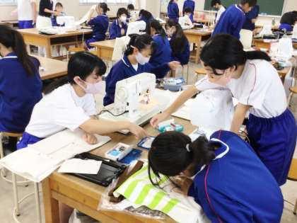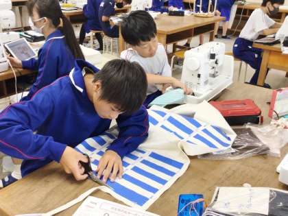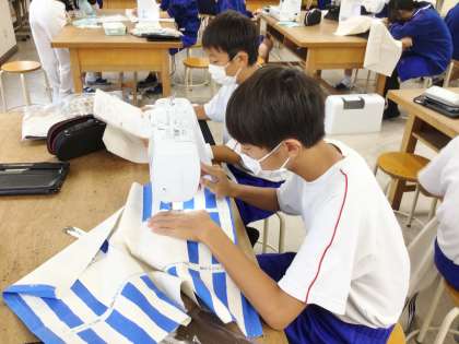 12学級は、家庭科の「バルキーバック制作」の授業の様子です。自分の進度に合わせて一生懸命制作を行っていました。