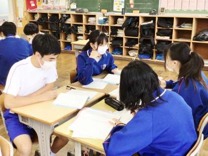 10/5(木) 授業の様子です(3年生) 1 公開日 2023/10/05 更新日 2023/10/05 お知らせ 3年生の授業の様子です。 31学級は、国語の「故郷」の授業の様子です。学習課題「登場人物の外見や内面は過去と現在でどのように変化したか」について、自分で考えをまとめた後、班で話し合っていました。