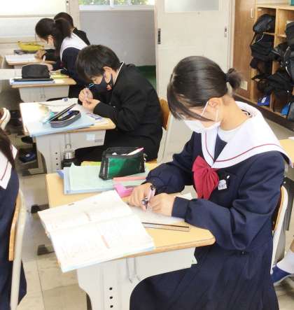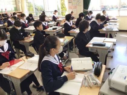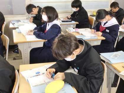 11学級は、数学の「移動と作図」の授業の様子です。直線上の1点を通る垂線の作図をコンパスを使って書いていました。「できた!できた!」「やったぜ!完成!」という声が聞こえてきました。