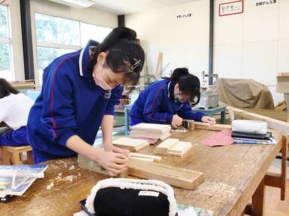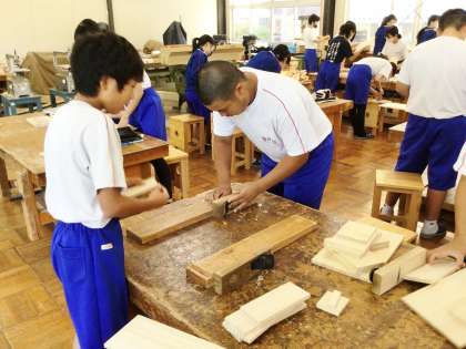 13学級は、技術の「オリジナル木工製作」の授業の様子です。仕上がり寸法線を意識して、カンナがけを行っていました。「カンナを使うのは初めてで、うまくできるか心配です」と言っていましたが、とても上手に行っていました。