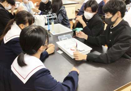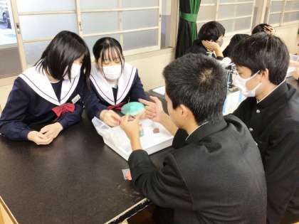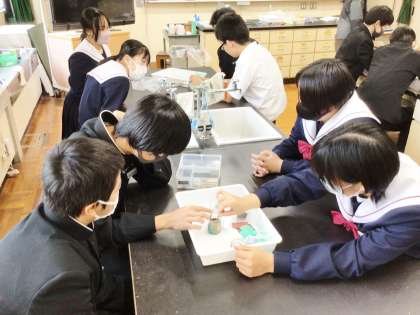 32学級は、理科の「化学変化と電池」の授業の様子です。「ダニエル電池では、どのような仕組みで電子エネルギーをとり出せるか」を実験を行いながら検証していました。