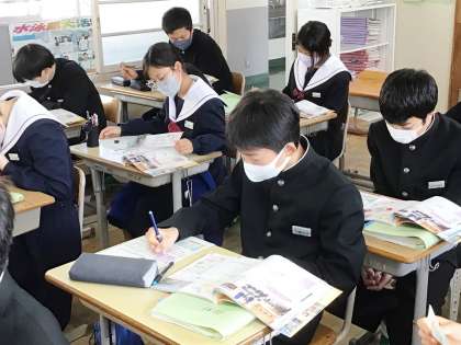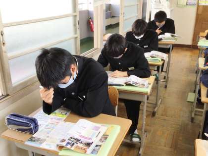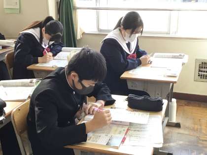 33学級は、社会の「行政の仕組みと内閣」の授業の様子です。議院内閣制の仕組みについて、学習プリントにまとめながら理解を深めていました。