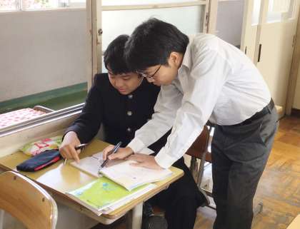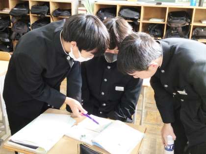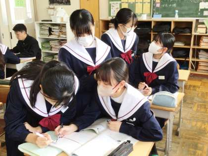 34学級は、数学の「図形と相似」の授業の様子です。相似条件を使った証明の練習問題を解いていました。疑問点があると、級友や教師に聞きながら解き方・考え方について確認していました。