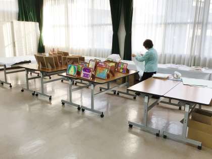 下の写真は、梅坪台交流館大会議室で作品展示の準備を行っている様子です。