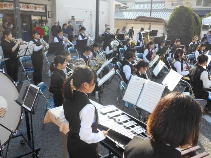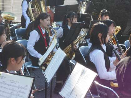 梅坪台交流館ふれあい祭りのオープニングで演奏を披露している吹奏楽部の様子です。