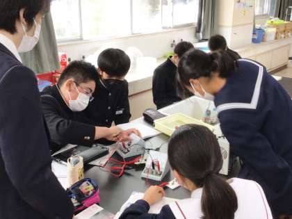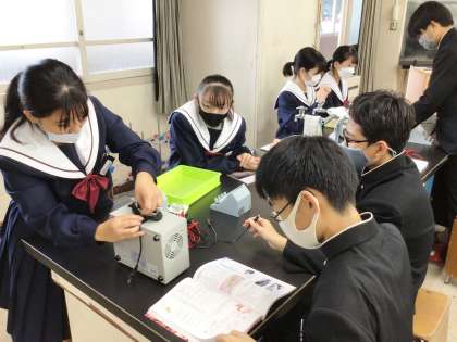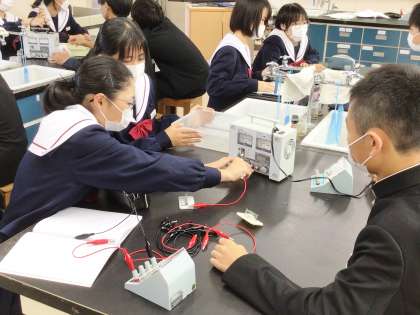 23学級は、理科の「電流と回路」の授業の様子です。「抵抗を2個つないだときの全体の抵抗を調べよう」について、実験を行っていました。