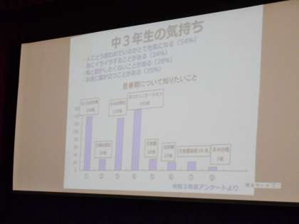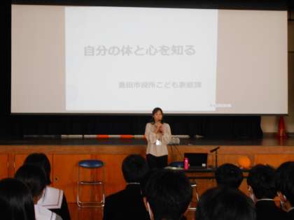 豊田市役所の子ども家庭課の職員が来校し、3年生の生徒に「自分の体と心を知る」のテーマで、思春期の気持ちの変化、体の変化などで心が不安定になったときの対応について、具体的に話を行いました。今日の話を今後の生活にいかしていきましょう。