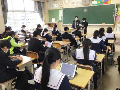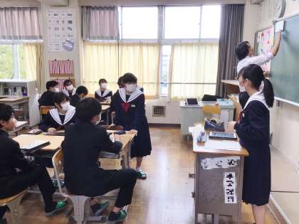 生徒会長が後期の生徒会の取組について、全校放送で話を行いました。その後、学級の各委員会の生徒が、タブレット画面に映し出された各委員会の活動内容等を伝達しました。活動内容を聞いた生徒は、活動内容について挙手し質問するなど、意欲的に参加していました。