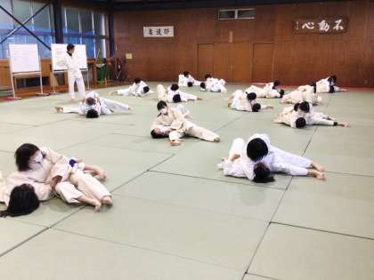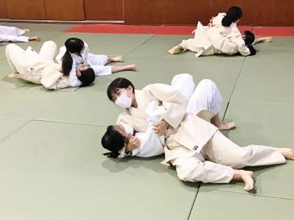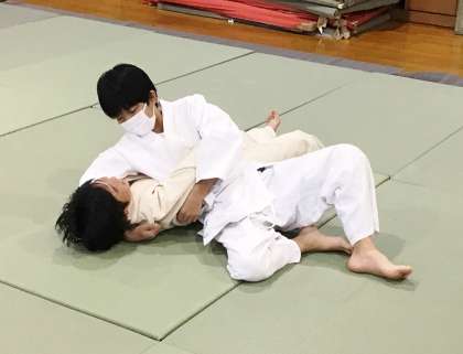 11学級は、体育の「柔道」の授業の様子です。袈裟固のポイントである「相手の右手を左脇に挟み、右手で奥襟をつかみ首を抱える」 を確認した後、実際にペアになって、練習していました。