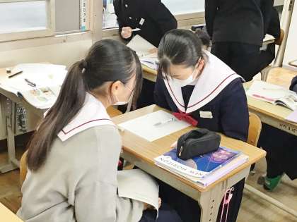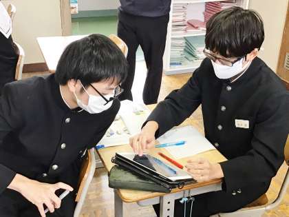 33学級は、英語の「仮定法」の授業の様子です。仮定法の和訳の行い方について疑問点があると、級友や教師と相談し確認していました。