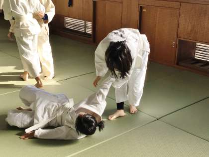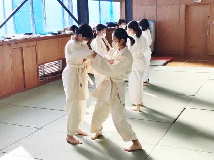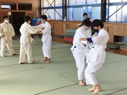 23学級は、体育の「柔道」の授業の様子です。投げ技の練習を行っていました。投げ技の行い方について、学習用タブレットの動画を視聴しながら、技のかけ方等を確認した後、ペアで練習を行っていました。