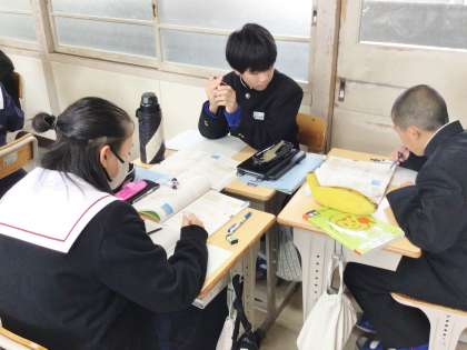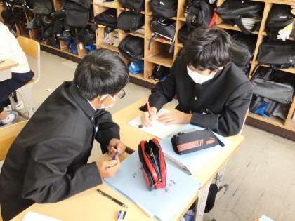 11学級は、数学の「円とおうぎ形」の授業の様子です。円の周の長さと面積について練習問題を解いていました。疑問点があると、グループで話し合っていました。「そっか、なるほど、ありがとう」という声や、わかりやすい説明をした人に対して拍手をするなど、温かい雰囲気で学び合っていました。