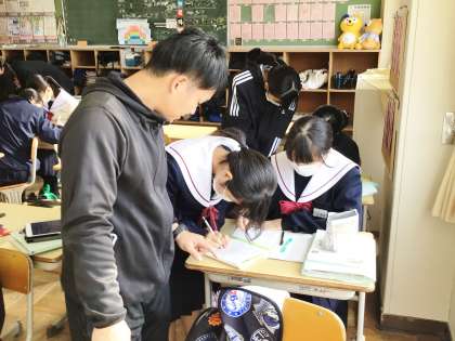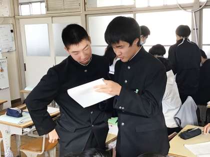 11/16(木) 授業の様子です(3年生) 1 公開日 2023/11/16 更新日 2023/11/16 お知らせ 3年生の授業の様子です。 31学級は、数学の「平行線と線分の比」の授業の様子です。中点連結定理を使った問題を解いていました。解き終わった後、級友と解き方・考え方について学び合っていました。