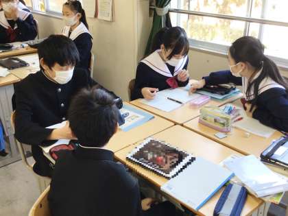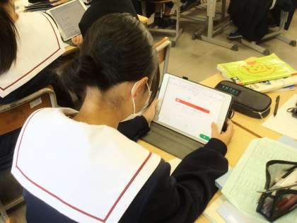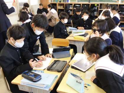 11学級は、数学の「円とおうぎ形」の授業の様子です。おうぎ形の弧の長さと面積の求め方について、班で話し合っていました。解き方が理解できた班は、キュビナの練習問題を行い、解き方・考え方の確認を行っていました。