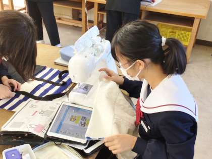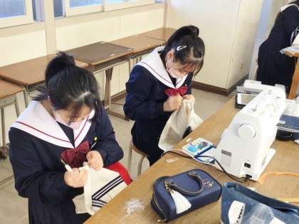 13学級は、家庭科の「バルキーバック制作」の授業の様子です。自分の進度に合わせて一生懸命制作を行っていました。いよいよ次の授業で完成予定です。