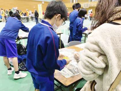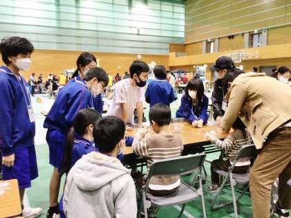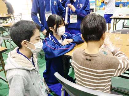 体験に来た小学生、幼児のこどもたちに寄り添い丁寧にスライム作りを教えていました。小学生、幼児の子どもはとても楽しそうに体験しており、保護者の方からも温かい言葉をかけてもらい、生徒はとても充実感を感じていました。