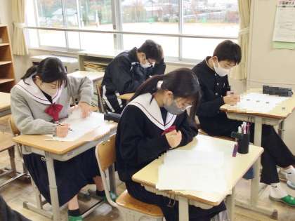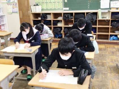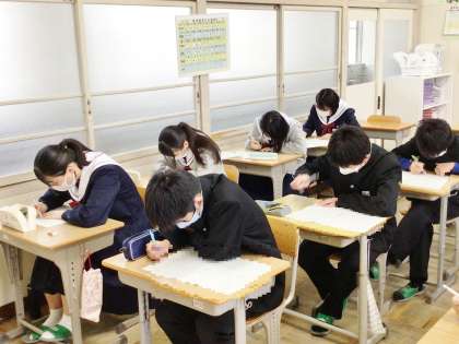 33学級は、数学の授業の様子です。来週行われる学習診断テストに向けて、対策プリントを集中して解いていました。解いている表情から緊張感が伝わってきました。