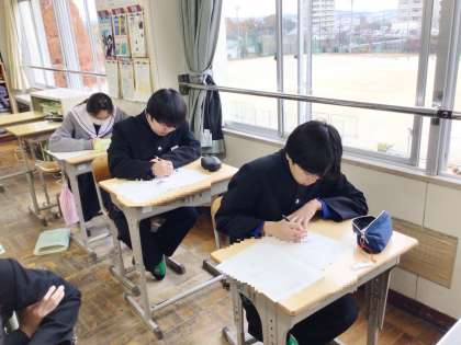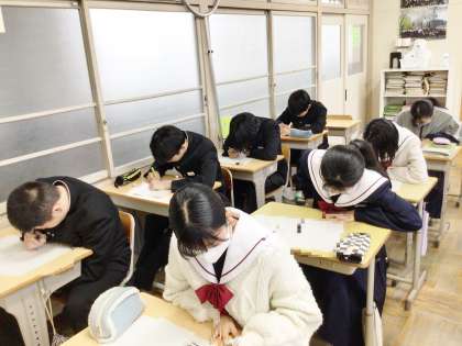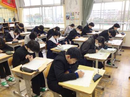 34学級は、数学の授業の様子です。来週行われる学習診断テストに向けて、対策プリントを集中して解いていました。学習診断テストの結果は、進路決定に向けて大切な資料となります。今までの学習の成果をすべて出し切ろう!