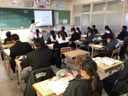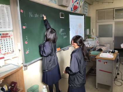 22学級は、英語の「A Glass of Milk」の授業の様子です。本文の内容を読み取りながら、問題を解いていました。解いた後、問題の解答を黒板に書き、解き方・考え方の確認を行っていました。