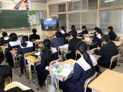 12学級は、社会の「巨大な農業生産力と移民」の授業の様子です。北アメリカの農業の特徴について、デジタル教科書の映像を見て認識を深めていました。映像を見ている生徒から「農地がすごく広い!」「日本とはスケールが違う」「機械を使って水やりなどを管理しているんだ」などの呟きが教室の至るところから聞こえてきました。